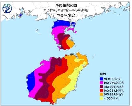 累計雨量大。9月30日20時至10月8日08時,海南平均降水量有608.1毫米,為歷史同期最多值。10月1日至8日,海南有8個市縣累計雨量超過800毫米,其中瓊海、萬寧、?、文昌等地累計雨量超過1000毫米,局部地區(qū)超過1400毫米,文昌三角庭農(nóng)場達(dá)到1499.2毫米。