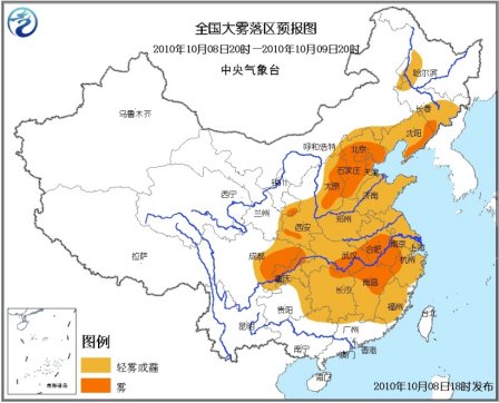預(yù)計,在新一股冷空氣帶來的風(fēng)雨沒有展開之前,中國中東部還將出現(xiàn)霧霾天氣。中央氣象臺今天下午18時發(fā)布今秋首次大霧藍(lán)色預(yù)警:預(yù)計今天夜間到明天上午,陜西中南部、華北、遼寧、吉林東部、黃淮、江淮、江漢、江南、四川盆地、重慶等地有輕霧或霾,其中,山西東部、河北大部、京津、遼寧東部、四川盆地中部、重慶北部、湖北東部、安徽中南部、江西北部、浙江西部等地的部分地區(qū)有能見度不足1000米的霧,局部地區(qū)能見度不足500米。