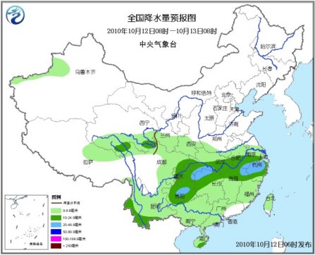 中新網(wǎng)10月12日電 據(jù)中央氣象臺預報,未來三天,新疆西部山區(qū)、西藏東部、青海東部和南部、內(nèi)蒙古東北部、黑龍江西北部、甘肅南部、川西高原西北部等地有小到中雨(雪)或雨夾雪,西藏東北部、青海東南部局地有大雪;陜西南部、黃淮南部、江淮、江漢、江南、華南、西南等地有小到中雨或陣雨,其中,四川南部、重慶中北部、貴州中部、云南北部、湖南北部、湖北南部、江西北部、安徽南部、浙江中部等地有大雨,上述地區(qū)局部并伴有短時雷雨大風等強對流天氣。