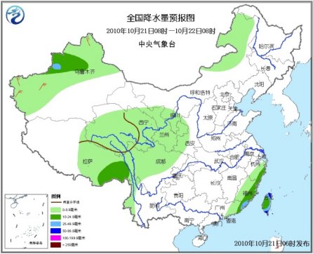 21日08時至22日08時,新疆北部和西部、西藏東部、青海大部、川西高原中北部、內(nèi)蒙古東北部等地有小雨(雪)或雨夾雪;甘肅中東部、寧夏中南部、陜西西南部、四川盆地西北部、云南西北部、浙江東南部、福建大部、廣東東部、臺灣等地有小到中雨或陣雨,其中,福建東南部、臺灣等地有大雨,局地有暴雨;上述局部地區(qū)并伴有短時雷雨大風等強對流天氣。新疆北部、東南部沿海等地有4~6級風,新疆西北部山口地區(qū)風力可達8~9級。南海東北部海域的風力將有10~13級、陣風可達14~15級;“鲇魚”中心經(jīng)過的附近海域的風力將有14~16級、陣風可達17級及以上;東海大部、臺灣海峽、南海西北部將有7~9級大風。