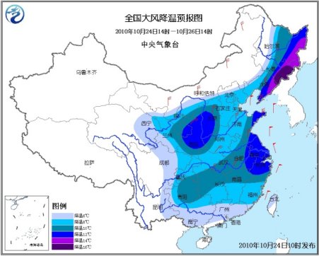預(yù)計(jì),10月24日14時(shí)至26日14時(shí),西北地區(qū)中東部、內(nèi)蒙古南部、東北、華北、黃淮、江淮、江漢、江南、華南大部、西南地區(qū)中東部等地將出現(xiàn)6~12℃降溫,其中,黑龍江東南部、吉林東部、遼寧東部等地的部分地區(qū)降溫幅度可達(dá)14~16℃;上述北方大部地區(qū)伴有5~7級(jí),南方有4~6級(jí)偏北風(fēng)。甘肅中部、青海中東部、寧夏、陜西北部等地將有雨夾雪或小到中雪,局地有大雪。