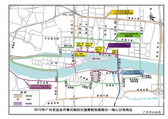 11月12日廣州亞運會開幕式將在天河區(qū)珠江新城南側(cè)的海心沙島舉行,廣州市政府、市公安局、市交警支隊9日晚召開了新聞通氣會,通告了當(dāng)夜海心沙島周邊道路及珠江巡游兩岸道路分時分段交通管制的詳細(xì)措施。