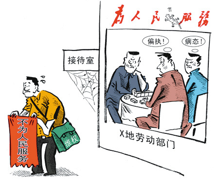 曾在無(wú)錫新區(qū)某公司工作的周力向當(dāng)?shù)貏趧?dòng)保障監(jiān)察大隊(duì)實(shí)名舉報(bào),要求公司補(bǔ)償加班費(fèi)。但勞保監(jiān)察隊(duì)負(fù)責(zé)人稱,從勞動(dòng)的相關(guān)法律法規(guī)來(lái)看,想要從勞動(dòng)部門(mén)解決此事,已經(jīng)很難。為此,周力給勞動(dòng)部門(mén)送上一幅“不為人民服務(wù)”的錦旗。(現(xiàn)關(guān)報(bào)道見(jiàn)今日本報(bào)8版)