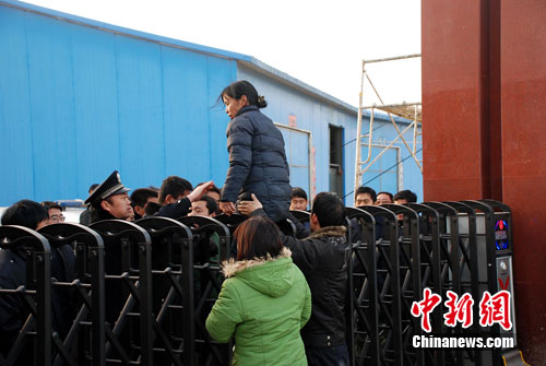 在雙方僵持不下的情況下,這名記者想翻門進入,但遭到數(shù)名看大門人的人墻式的阻攔。 經(jīng)過反復(fù)僵持、協(xié)商,終于有一名記者被允許翻門進入。