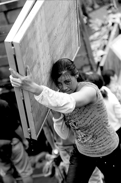 羅炳輝將軍廣場是彝良最大的災(zāi)民安置點之一,2000名受災(zāi)群眾集中安置在百余個帳篷內(nèi)。50多歲的毛振強和老伴帶著兩個孫子一起住在帳篷里。前天夜間,他和安置點的其他人一樣,被大風和暴雨擾得睡不著覺。昨天凌晨1點左右,廣場上開始積水,很快水就漫過薄薄的紙板,被褥衣物都洇濕了!拔覀冓s緊把東西收拾起來,就這么站了一夜沒能睡覺。”由于帳篷內(nèi)物品進水,昨天白天,安置點內(nèi)的很多災(zāi)民連坐的地方都沒有,蹲在地上吃飯,也沒法睡覺。