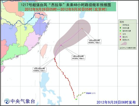 另外,今年第17號超強臺風(fēng)“杰拉華”的中心28日05時位于中國臺灣省花蓮市東南方大約310公里的西北太平洋洋面上,中心附近最大風(fēng)力16級(52米/秒),中心最低氣壓為930百帕。預(yù)計,“杰拉華”將以每小時15公里左右的速度向偏北轉(zhuǎn)東北方向移動,逐漸向日本南部一帶沿?拷瑥姸染徛郎p弱。