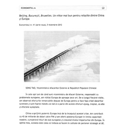 中新網(wǎng)11月9日電 據(jù)外交部網(wǎng)站消息,2012年11月5日,羅馬尼亞主流媒體《經(jīng)濟學家報》和《九點鐘報》分別用羅、英兩種文字全文刊登中國外交部副部長宋濤署名文章《為了中歐關(guān)系的美好未來》。