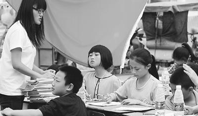 4月25日,蘆山縣地震災區(qū)的孩子們在志愿者建立的臨時帳篷學校里補習功課。