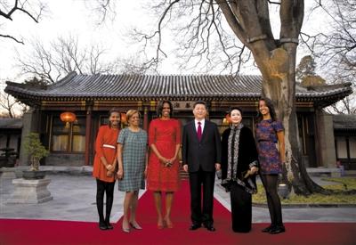 昨日下午,釣魚臺國賓館的養(yǎng)源齋前,習近平夫婦與米歇爾一家合影。