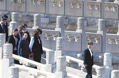 彭麗媛和米歇爾一行由西華門進入故宮,故宮博物院院長單霽翔陪同講解。