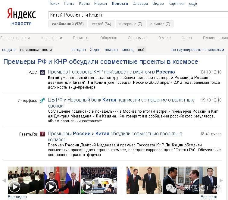 俄羅斯最大的搜索引擎Yandex.ru:當(dāng)在這里輸入“中國(guó)”、“俄羅斯”、“李克強(qiáng)”等詞條的時(shí)候,你能夠看到數(shù)以千計(jì)的消息,內(nèi)容涵蓋了李總理訪俄期間的所有活動(dòng)與話題。