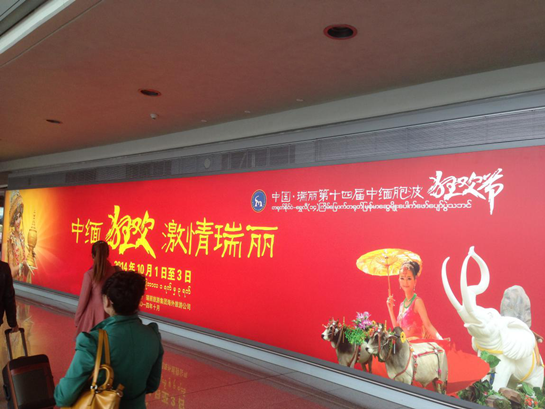 11月10日,記者在昆明長水國際機場轉機前往緬甸時在機場拍下的中緬胞波狂歡節(jié)宣傳廣告。(新華社記者 桂濤攝)