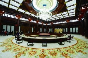 這次APEC期間,領(lǐng)導(dǎo)人圓桌會(huì)議是在雁棲湖國(guó)際會(huì)議中心集賢廳內(nèi)召開的。昨日,記者首次走入這個(gè)1200平方米的會(huì)議廳。負(fù)責(zé)集賢廳室內(nèi)設(shè)計(jì)的清華大學(xué)美術(shù)系教師馬怡西介紹說,整個(gè)廳高12米,主要采用木質(zhì)材料,最大亮點(diǎn)是木制裝修與景泰藍(lán)技藝的結(jié)合。