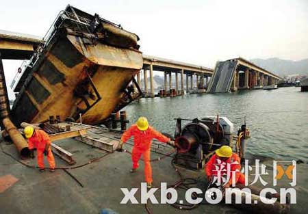 記者昨天在九江大橋現(xiàn)場(chǎng)時(shí),斷橋橋面上已多了不少工程設(shè)備,斷橋下的江面也沒閑著,幾條工程船正在繁忙施工,將肇事運(yùn)沙船包圍了起來,從岸上幾乎已看不到沉船的蹤影。斷橋和沉船周圍已經(jīng)打入不少固定用的鋼梁,頭戴安全帽的工人正在緊張施工,不時(shí)傳來陣陣打樁聲。據(jù)介紹,修復(fù)專責(zé)小組成立后,先后派過60多個(gè)潛水員下水探摸,發(fā)現(xiàn)40米深的水底有超過1萬噸的斷橋殘骸——修復(fù)斷橋要比建一座新橋還要難得多。