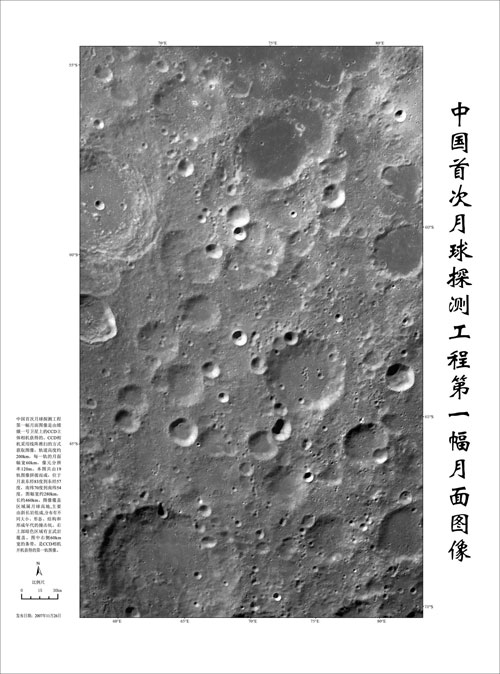 嫦娥一號衛(wèi)星于10月24日從西昌衛(wèi)星發(fā)射中心由長征三號甲運載火箭成功發(fā)射,經(jīng)過8次變軌后,于11月7日正式進入工作軌道。經(jīng)過星上設備調(diào)試,11月18日衛(wèi)星轉(zhuǎn)為對月定向姿態(tài),11月20日開始傳回探測數(shù)據(jù),經(jīng)過處理制作完成了第一幅月面圖像并同時完成了三維影像的制作。