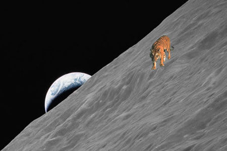 一個頭腦機靈的網(wǎng)民把華南虎“調(diào)”到月球上。利用電腦合成軟件,他把老虎照和月亮成像照合成在一起,上寫說明云:“嫦娥一號發(fā)回首張照片,月球上發(fā)現(xiàn)華南虎一只,專家正在對照片真假做鑒定,預計結果將會在中國人登月后公布(大約2020年)。”