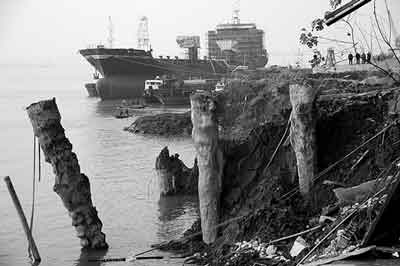 大江船廠對(duì)此有不同的看法。大江船廠相關(guān)負(fù)責(zé)人說,江東船廠正在建造一個(gè)3萬噸級(jí)船臺(tái)及舾裝碼頭,在船臺(tái)建設(shè)打樁過程中,由于震動(dòng)過大,引起大江船廠地面開裂。11月30日,大江船廠發(fā)現(xiàn)江邊倉庫墻面出現(xiàn)裂痕,立即向江東船廠通報(bào),對(duì)方派人到現(xiàn)場(chǎng)查看后,疏散了住在平房里的10多名工人,當(dāng)天凌晨,江堤發(fā)生了坍塌事故。目前僅存放在倉庫里油漆就損失了上百萬元。