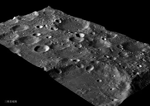上圖顯示的是中國首張月球三維立體圖片,拍攝于距離月球200公里左右的飛行軌道上,成像區(qū)域和中國之前公布的第一張月球表面圖大致相當(dāng),位于月球正面的右下角,但是表面積略小。