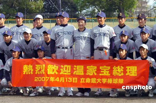 4月13日,中國總理溫家寶訪問日本期間,在京都西京極球場與當地大學生棒球隊員一同打棒球。圖為溫家寶與同場練球的大學生們合影。 中新社發(fā) 王健 攝