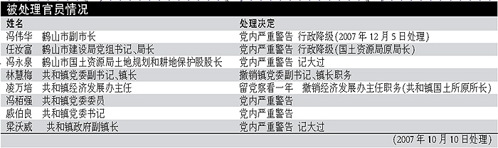 據(jù)監(jiān)察部、國土資源部12月11日發(fā)布的通報(bào),鶴山市通過偽造虛假材料和化整為零的辦法,擅自調(diào)整規(guī)劃、違法補(bǔ)辦手續(xù),違規(guī)批準(zhǔn)該市共和鎮(zhèn)3626.8畝土地用于工業(yè)開發(fā),受到監(jiān)察部、國土資源部專案調(diào)查組的嚴(yán)厲批評。記者采訪了解到,江門市紀(jì)委、監(jiān)察局已經(jīng)對鶴山市副市長馮偉華給予嚴(yán)重黨內(nèi)警告、行政降級處分,給予國土局原局長任汝富黨內(nèi)嚴(yán)重警告、行政降級處分。