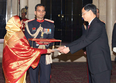 遞交國書儀式在印度總統(tǒng)府阿育王殿舉行。張炎大使向帕蒂爾總統(tǒng)遞交了由中國國家主席胡錦濤簽發(fā)的國書。帕蒂爾總統(tǒng)對張大使抵印履新表示歡迎,請張大使轉達對胡錦濤主席的親切問候。她表示,印度重視印中關系的發(fā)展,希望加強兩國在各領域的合作,造福于兩國人民。