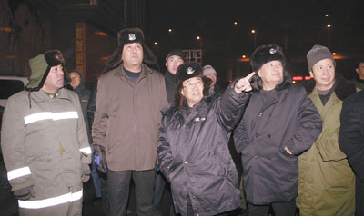 圖為新疆維吾爾自治區(qū)黨委副書記、自治區(qū)代主席努爾·白克力(左一),自治區(qū)黨委副書記、自治區(qū)常務副主席楊剛(右二),烏昌黨委書記、烏魯木齊市委書記栗智(右三),市委常委、市政協主席、市委秘書長黃公毅(右一)在火災現場指揮撲救工作。
