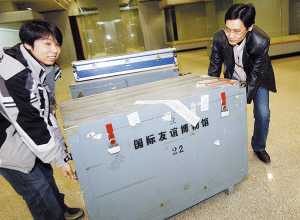 昨天下午1時(shí)許,在工作人員嚴(yán)密押送下,4個(gè)裝載著國(guó)禮珍品的密封箱運(yùn)抵周鄧紀(jì)念館院內(nèi)。還未見(jiàn)珍品,那些專(zhuān)門(mén)為展品“量身定做”的箱子就讓人很感興趣,每個(gè)箱子都有1米多高,由于展品極其珍貴且是易碎品,在包裝時(shí)里面不僅加了防震的材料,箱子外面也特別注明易碎標(biāo)志,每一件珍品都被固定在專(zhuān)門(mén)的錦盒中,且是根據(jù)它們的大小和形狀量身定做的。