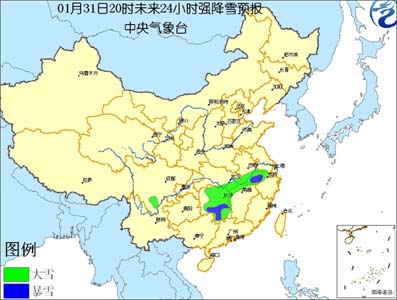 中新網(wǎng)1月31日電 中央氣象臺今天下午六點鐘發(fā)布大雪預(yù)報:受冷暖空氣的共同影響,預(yù)計今天夜間到明天白天,湖南大部、湖北東南部、安徽南部、江蘇西南部、浙江西北部、江西北部以及四川高原南部等地有中到大雪,其中,湖南南部、安徽南部的局地有暴雪。