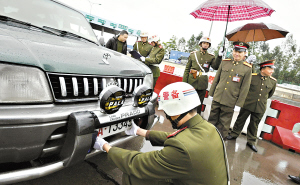 使用迷彩布遮蓋軍車(chē)號(hào)牌的行為將受到查處。昨日,廣州警備區(qū)協(xié)調(diào)陸、海、空軍、武警和公安,組織開(kāi)展了打擊假冒軍車(chē)行動(dòng)。廣東省軍區(qū)副參謀長(zhǎng)閻學(xué)亭,廣州警備區(qū)司令員顏小明和參謀長(zhǎng)張?jiān)粕剑瑏?lái)到現(xiàn)場(chǎng)進(jìn)行指導(dǎo)。昨日早上在廣氮收費(fèi)站的查車(chē)點(diǎn),執(zhí)勤人員扣押了9輛冒牌軍車(chē)。