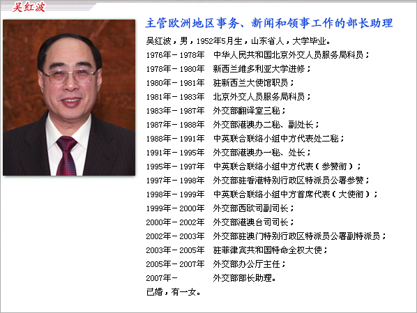 中國(guó)外交部資料顯示,吳紅波從二00五年起至二00七年擔(dān)任外交部辦公廳主任一職,二00七年至今擔(dān)任外交部部長(zhǎng)助理。劉結(jié)一在二00六年至二00七年一年時(shí)間里,擔(dān)任了外交部美大司司長(zhǎng),二00七年至今一直為外交部部長(zhǎng)助理。