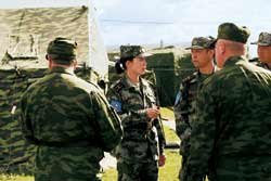 在“和平使命——2007”聯(lián)合軍演六國參演部隊演習(xí)場上,一位扎著馬尾辮的中國女少校引起俄軍官兵注目,大家都喜歡送花給她,稱她卡林娜,意思是來自中國的紅莓花。她叫董英華,新疆軍區(qū)某部副團(tuán)職俄語翻譯。