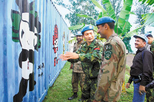 為了宣傳奧運(yùn),維和官兵在營(yíng)院里面制作了各種各樣的奧運(yùn)標(biāo)志。充作庫房的集裝箱上噴繪的是福娃的形象,草坪中的一片空地上,則是官兵們用簡(jiǎn)易器材做成的五環(huán)圖案和“Beijing2008”字樣。作戰(zhàn)組參謀張寶軍向前來參觀的外國(guó)友人一一作著介紹,還特別介紹了奧運(yùn)會(huì)會(huì)徽標(biāo)志代表的里程碑、承諾、形象、美麗、英雄、精神、邀請(qǐng)等七層含義。當(dāng)?shù)亟逃齾f(xié)會(huì)的阿里特邊聽邊記,還將中國(guó)印和五個(gè)福娃的形狀畫了下來。聯(lián)剛團(tuán)志愿者部門的卡爾松則連聲說,要調(diào)整假期到北京去看奧運(yùn)會(huì)比賽……