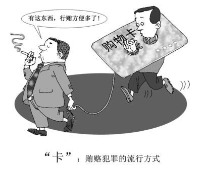 “卡”即代幣卡、購物卡等消費卡的代名詞。調(diào)查表明,在賄賂犯罪中,以卡代錢容易掩蓋赤裸裸的金錢交易。一張卡少則數(shù)百元,多則上萬元,因為它不像現(xiàn)金那樣扎眼,所以行賄者容易出手,受賄者容易接受。送卡已成為賄賂犯罪的一種流行方式。