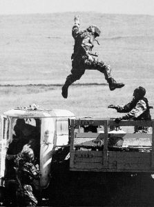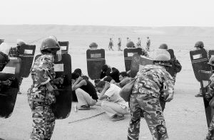 前方指揮部王部長立即下達捕殲命令。頓時,一排排突擊炮彈朝著“恐怖分子”駕車沖來的公路傾瀉。直升機飛臨上空。第五作戰(zhàn)小組10多名戰(zhàn)斗隊員從直升機上躍下,直撲“恐怖分子”。