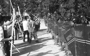 短時間內(nèi),由一百多名該分區(qū)人武部“處突”官兵、應(yīng)急分隊民兵組織“突擊分隊”全副武裝集合完畢。然后,他們分乘3輛大卡車快速向目標地域開進。