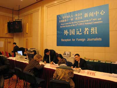 在記者的接待和安排方面,今年全國(guó)兩會(huì)在借鑒以前中共十七大期間一些好的做法的基礎(chǔ)上,還為中外記者推出了免費(fèi)上網(wǎng),免費(fèi)提供有關(guān)中國(guó)的圖書(shū)資料以及咖啡和餐點(diǎn)等一系列的貼心“服務(wù)”。祝壽臣介紹說(shuō):“這屆的兩會(huì)新聞中心借鑒了十七大一些好的做法,當(dāng)然同時(shí)也繼承了過(guò)去兩會(huì)新聞中心的一些好做法,增加了很多新的服務(wù)項(xiàng)目。比如第一次免費(fèi)提供中央人民廣播電臺(tái),中央電視臺(tái)的信號(hào),第一次免費(fèi)向記者提供新華社的適時(shí)新聞圖片,第一次免費(fèi)向記者提供寬帶上網(wǎng)服務(wù),同時(shí)我們還免費(fèi)向記者提供咖啡和茶點(diǎn)服務(wù)。此外,這次兩會(huì)還提供了很多圖書(shū)資料,有中國(guó)政治經(jīng)濟(jì)各方面的情況介紹,還有一些專題資料,資料種類大概有100多種,資料擺上來(lái)以后很快就被中外記者搶空了!