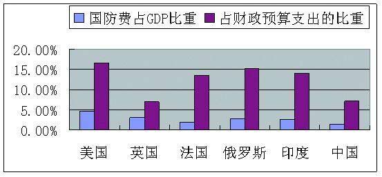 從絕對(duì)指標(biāo)來看,以2004年為例,美國的國防費(fèi)占全球國防費(fèi)總開支的47%,日本占4.1%,而我國僅占2.4%。從相對(duì)指標(biāo)看,美國國防開支占GDP的3.9%,我國是1.38%,其為我國的2.5倍。在國民人均國防費(fèi)開支、每平方公里平均國防費(fèi)等方面,我國在世界上均處于很低的水平。