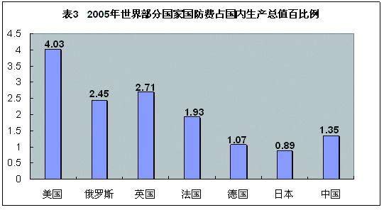 其次,我國國防費(fèi)的適度增長(zhǎng)可以通過與類似國家國防費(fèi)增長(zhǎng)的情況加以對(duì)比來說明。通過《2006年中國的國防》提供的兩組數(shù)據(jù),一是2005年世界部分國家國防費(fèi)占GDP比例(見圖三),二是中國與幾個(gè)國家的對(duì)比情況,中國國防費(fèi)僅相當(dāng)于美國的6.19%、英國的52.95%、法國的71.45%、日本的67.52%?梢钥闯,我國國防費(fèi)的增長(zhǎng)總體上還處于較低的水平,也比較符合我國的經(jīng)濟(jì)發(fā)展?fàn)顩r,是一種適度的補(bǔ)償性增長(zhǎng)。