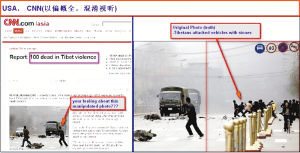 其一是“以偏概全,混淆視聽”。3月17日,CNN和法新社在各自網(wǎng)站上使用了同一張圖片,圖中兩輛綠色卡車一前一后正向兩名平民駛來——事實(shí)上,如果完整展示圖片的話,可以看到當(dāng)時(shí)軍車旁有約10名暴徒在向軍車投擲石塊,雖然CNN網(wǎng)站的圖片說明寫的是“藏人向軍車投擲石塊”,但圖中卻看不見這一已被裁去的場(chǎng)景。
