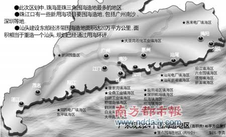 李珠江在昨日的新聞發(fā)布會(huì)上表示,新一輪的大發(fā)展,就是要加快建設(shè)粵東、粵西、珠三角三個(gè)海洋經(jīng)濟(jì)帶,大力發(fā)展能源、石化、鋼鐵和造船四個(gè)產(chǎn)業(yè)群,推動(dòng)扶持30個(gè)重大項(xiàng)目建設(shè)投產(chǎn)。新獲批的《區(qū)劃》劃定了146平方公里的圍海造地區(qū),相當(dāng)于5.5個(gè)澳門,最大限度地支持沿海地區(qū)的重大項(xiàng)目用海。《區(qū)劃》中劃定了24個(gè)圍海造地區(qū),重點(diǎn)圍海造地區(qū)有10個(gè)(見(jiàn)上圖)。