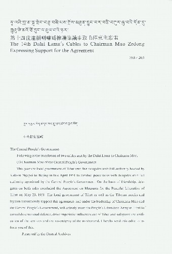 1951年5月,中華人民共和國中央人民政府和西藏地方政府簽訂了《關(guān)于和平解放西藏辦法的協(xié)議》。同年10月,達賴?yán)镏码娒珴蓶|主席,擁護協(xié)議。在這份第十四世達賴?yán)餅閾碜o協(xié)議事致毛澤東主席的電報中,達賴?yán)锩鞔_表示要“在毛主席及中央政府領(lǐng)導(dǎo)下”“保護祖國領(lǐng)土主權(quán)的統(tǒng)一”。這份電報全文如下: