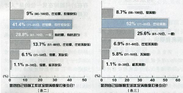 調(diào)查顯示,盡管大多數(shù)中青年干部的心理是健康的,但由工作、生活、人際等諸多壓力而造成的心理沖突、心理失衡和精神壓抑是無處不在、無時不有的。受訪者在回答“如果您覺得活得很累,您認(rèn)為您的壓力主要來自哪些方面?”這一問題時,選擇最多的前三項分別是“工作責(zé)任心太強,追求完美之累”,“工作負(fù)荷重,疲于奔命之累”,“迎合領(lǐng)導(dǎo)出政績,失去自我之累”,選擇比例分別達(dá)到了51.3%,34.7%和29.2%,而選擇“交際太繁,苦于應(yīng)酬之累”,“前程靠人恩賜,職場非正常競爭之累”的各占20.3%,并列排在第四位,最后依次是“家庭負(fù)擔(dān)重,子女入學(xué)就業(yè)之累”,占12.9%,“與同事、朋友比心理不平衡之累”,占5.9%,以及“多種壓力”等,占2.6%。