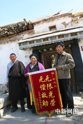 今天中午,來(lái)自云南昭通水富縣向家壩的進(jìn)藏種菜工稅代超捧著一面繡有“無(wú)限光榮,無(wú)償救助”的錦旗,走進(jìn)了這個(gè)曾是他生命庇護(hù)所的普通藏家小院,向兩位老人深深地鞠了一躬。