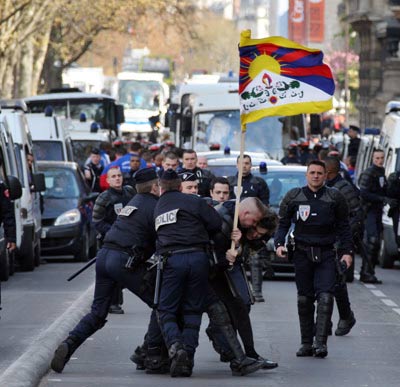 *當(dāng)官方的奧運(yùn)火炬抵達(dá)目的城市時(shí)著力突出西藏問題。