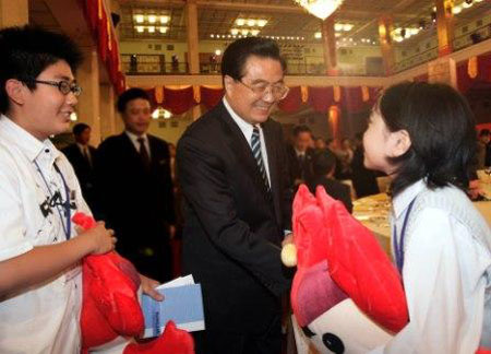 2007年6月19日,胡錦濤主席在北京人民大會(huì)堂出席“中日青年世代友好聯(lián)誼晚會(huì)”時(shí),日本訪問團(tuán)中年齡最小的成員橫堀由、大木博來(lái)到胡錦濤面前,請(qǐng)胡主席為他們簽名。胡錦濤高興地對(duì)他們說(shuō),從你們身上,我看到了中日友好事業(yè)的希望。他將兩個(gè)北京奧運(yùn)會(huì)的吉祥物“福娃”贈(zèng)送給他們。兩位日本少年臉上露出喜悅的笑容。