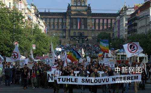 捷克首都布拉格5月5日再次爆發(fā)反對美國在捷克設(shè)立反導(dǎo)雷達基地的游行示威。大約1500名示威者展示“這個協(xié)定我們不接受”等標語從瓦茨拉夫廣場出發(fā)穿越市中心,舉行反對美國在捷克設(shè)立反導(dǎo)雷達基地的游行。(黃頻 攝)