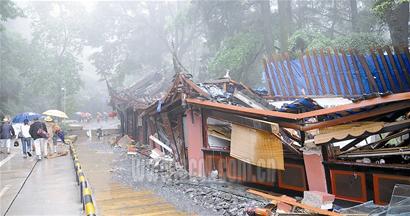 16日下午,記者來到都江堰景區(qū)二王廟古建筑群門口,廟門已經(jīng)殘缺不全,地上四處是殘磚斷瓦,建筑群內(nèi)的多個(gè)大殿坍塌。循著廟門朝山上看,廟內(nèi)紅磚青瓦的幽然境界如今已不復(fù)存在,處處是墻倒塌后露出的懸崖陡坡。一度是俯瞰整個(gè)都江堰水利工程的最佳觀景點(diǎn)的秦燕樓,更是只留幾堵殘?jiān)珨啾凇?/p>