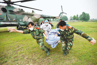 根據小分隊提供的信息,17日下午,綿竹市聯合陸軍航空兵某部對清平鄉(xiāng)重傷員實施了緊急救援。這是自12日發(fā)生地震后,從清平鄉(xiāng)接出的首批受傷群眾。(李 舸攝影報道)