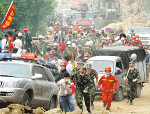5月17日下午3時(shí)40分,記者再次來(lái)到北川,剛剛走到救援部隊(duì)的大本營(yíng)——任家坪時(shí),就發(fā)現(xiàn)大量的災(zāi)民和救援人員往外涌,行進(jìn)的車輛和腳步匆匆的人群使路面揚(yáng)起了陣陣灰塵。重慶消防支隊(duì)一位戰(zhàn)士告訴我們,因?yàn)楸贝ê髠?cè)山頂?shù)乃畨慰赡軟Q堤,1個(gè)小時(shí)前已經(jīng)發(fā)出信號(hào)彈,要求救援人員和災(zāi)民撤離北川縣城。