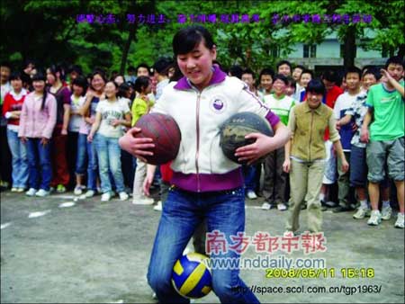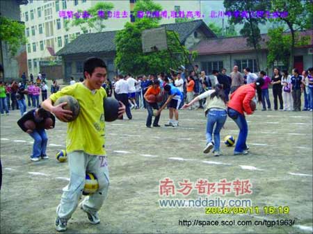 博客照片里在操場上歡笑的學(xué)生們,都是高三的孩子。地震前一天,高三年級(jí)搞了一個(gè)類似趣味運(yùn)動(dòng)會(huì)的活動(dòng)。唐老師說,高三的學(xué)生很久沒有這樣歡暢地玩過了,他們一直在為迎接高考而奮戰(zhàn)。那天距離高考只剩下了26天。北川中學(xué)是綿陽市的示范學(xué)校,每年的高考成績是北川的驕傲。
